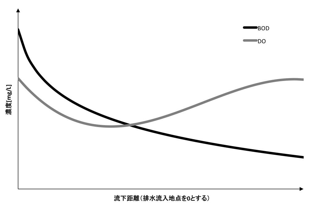 と求まります。概形は問題中の図2―1の通りですが、河川の環境を議論する上で、川の流速を一定として横軸を時間から距離に置き換えたグラフが用いられることがあります。このようなグラフを“溶存酸素垂下曲線”と呼びます。