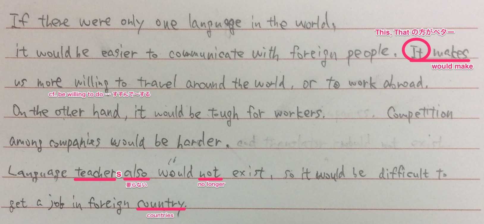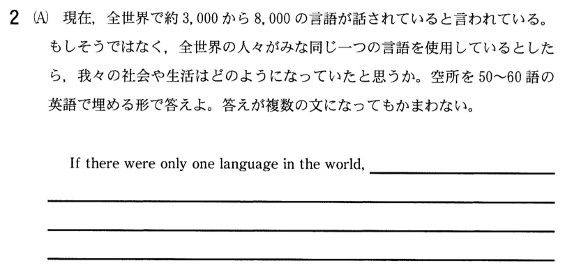 今回は2010年の問題を扱います。「世界に言語が一つしかなかったらどうなるか」というテーマについて、与えられてた英文の書き出しに続けて英文を書く形式ですね。