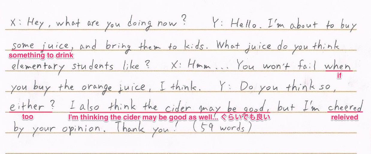 一読して指摘出来るのは “犬” に触れていない点。確かに生徒指導をする中でも同様の答案をしばしば目にします。会話の中で犬を取り上げるのが難しくてあえて触れなかったのか、それとも犬の存在そのものに気付いていなかったのか、その理由は定かではありませんが、写真に写っている ”ある要素” に触れている答案と、そうではない答案を比較すればどちらが質の高い答案かは一目瞭然です。