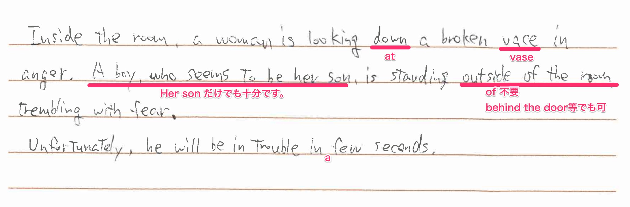もう一点は A boy, who seems to be her son, … の部分。先にも述べた通りイラストの登場人物の立場は自由に決めつけてしまって構いません。いきなり Her son… と書き始めてしまって良い訳ですね。特に今回のように指定語数が少ない場合は英文をコンパクトに纏めることが重要です。