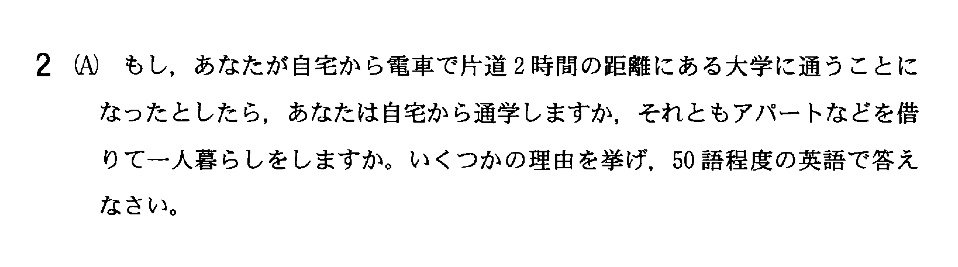 今回は2004年度の問題を扱いましょう。出題内容はいたってシンプル。「自宅から遠い大学に実家から通うかどうか」というテーマはこれから大学へ進学する皆さんにとって身近なものでしょうし、理由を考えるのにもそれほど苦労することは無いでしょう。
