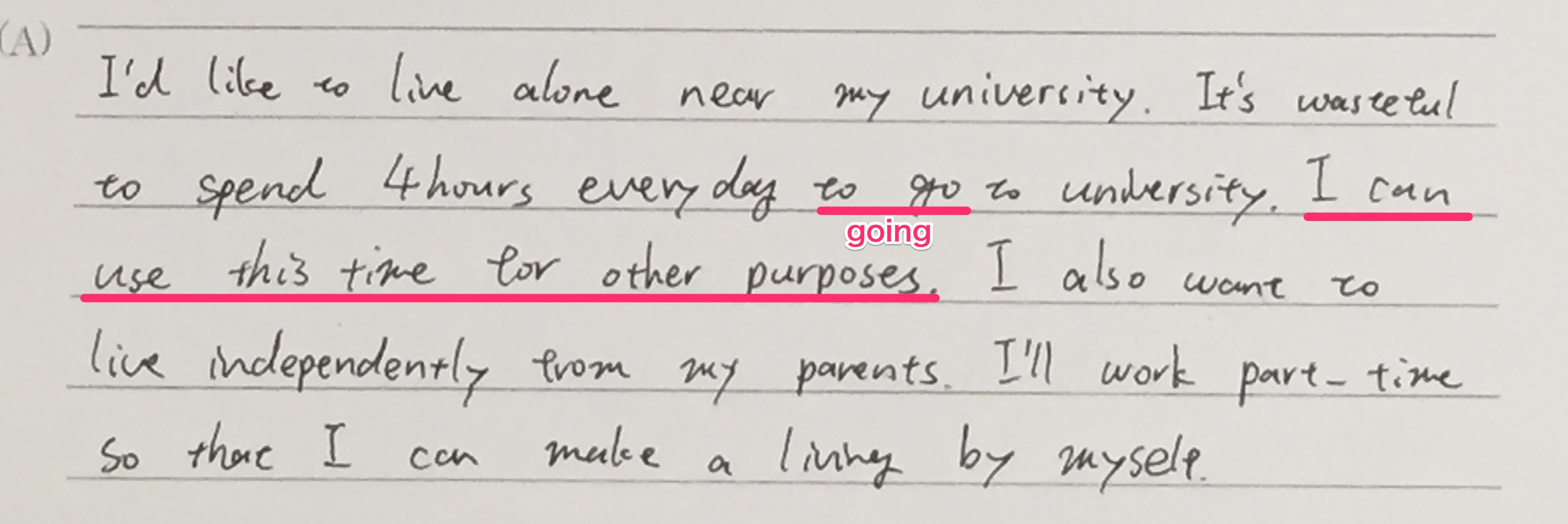 I’d like to live alone near my university. I have two reasons. First, I would rather spend time studying than commuting by train. It’s so wasteful to spend 4 hours everyday on the train. Second, I think college students should be independent from their parents. I’ll do part-time job so that I can make my living by myself.
