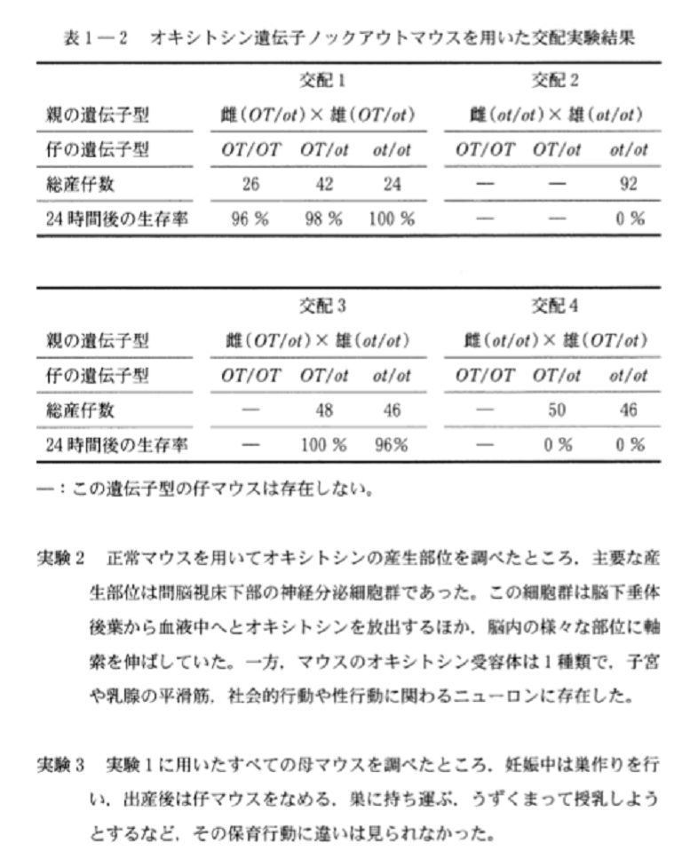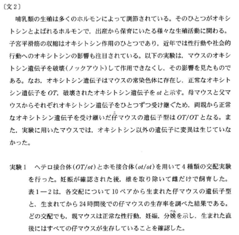 今回は、オキシトシンというホルモンの遺伝子をノックアウトしたマウスを用いた実験でした。「オキシトシンってなんだっけ??」という人、心配ご無用です。今回の問題は、オキシトシンの生理作用を知らなくても解けるようにできています。