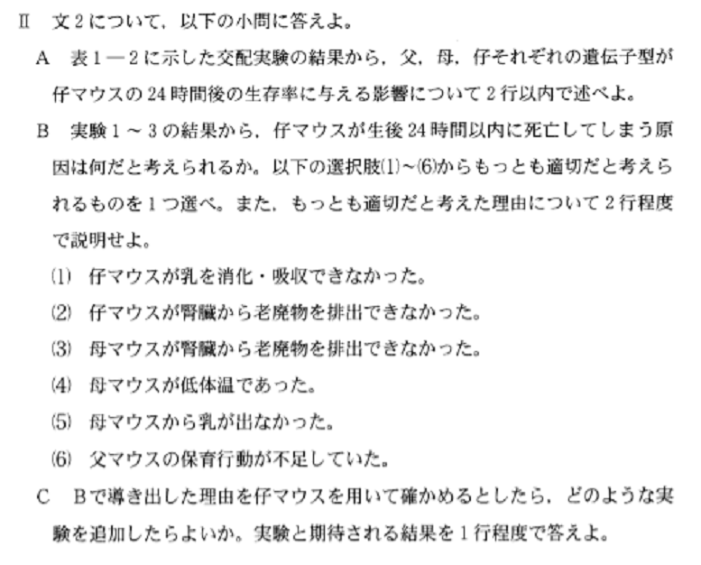 (解答例)遺伝子型がot/otの母の仔マウスに人為的に授乳すれば、仔マウスの生存率は上昇するはずである。(43字)