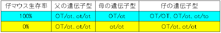 しかし、母の遺伝子型を見ると、母がOT遺伝子を持ってるときは仔の生存率は100%に、OT遺伝子を持たずot遺伝子しか持っていないと仔の生存率は0%になっています。