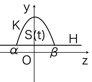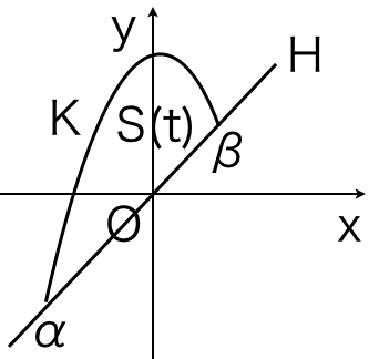 $z=t$で切った断面の面積$S(t)$を考える。曲面$K$と$z=t$の共通部分は$y=\dfrac{3}{4}-x^2-t^2$であり,平面$H$と$z=t$の共通部分は$y=x$である。よって,この放物線と直線で囲まれた図形の面積が$S(t)$である。放物線と直線の交点の$x$座標を$\alpha,\beta$とおくと,1/6公式より