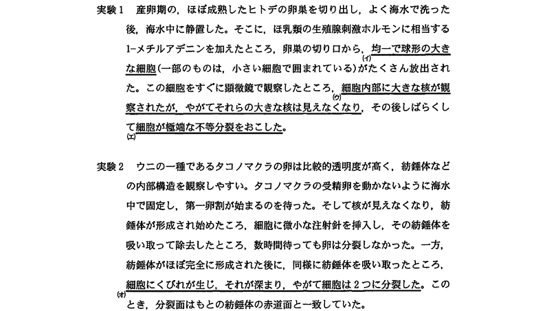 一般的な体細胞分裂と卵割の違いを答える問題です。これも知識問題ですね。よく聞かれるところなので、分からなかった人は教科書を要チェックです。
