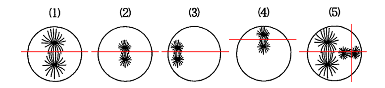 ここで、選択肢(1)~(5)を見てみましょう。選択肢のような位置に紡錘体が形成されていると、赤の線で描いたように細胞が分裂するはずです。