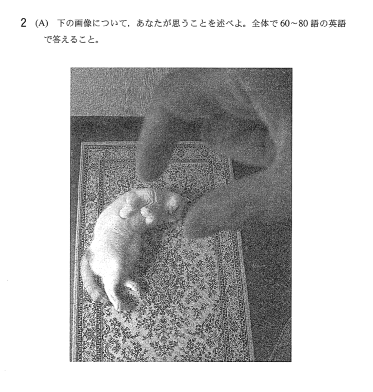 遠近法を使ったトリック写真であると考えるのが一般的でしょうか。撮影者がカメラに指を近づけることであたかも猫が指より小さい幻覚を抱かせた、と書くのが正攻法でしょう。しかし遠近法をうまく説明する自信がない人もいるのではないでしょうか。そのような人は別の発想をすることも出来ます。例えば河合塾は猫がミニチュアのフィギュアであり、本当に指よりも猫が小さいと解釈した模範解答を出しています。