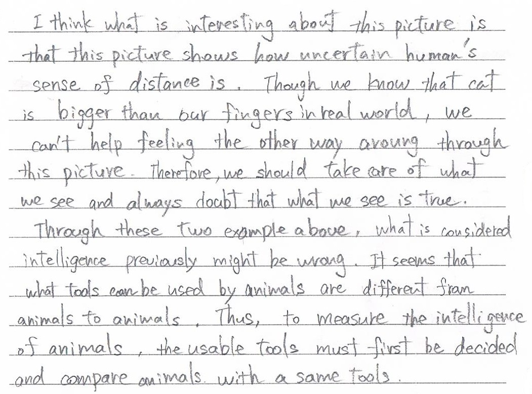 I think what is interesting about this picture is that this picture shows how uncertain humans’ sense of size is. Though we know that cats are bigger than our fingers in real world, we can’t help feeling the other way around through this picture. Therefore, we should take care of what we see and always doubt that what we see is true.