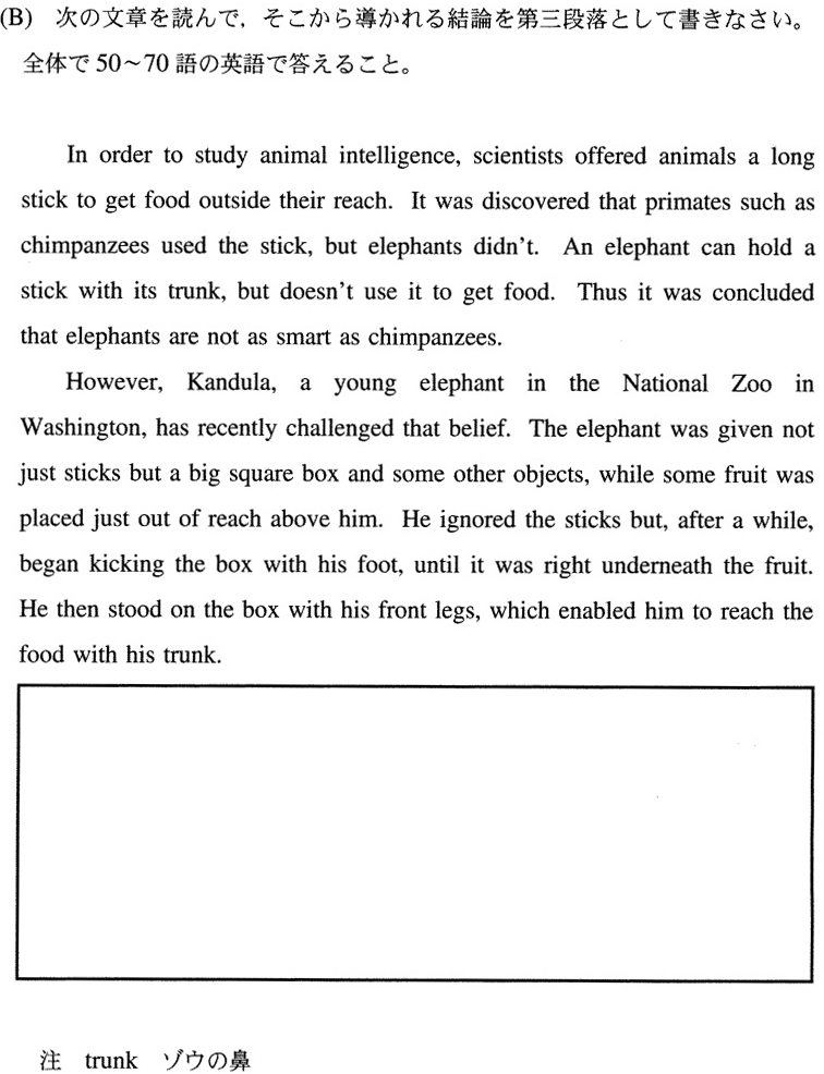 新傾向の問題ですが、与えられている第一段落、第二段落の英文自体は平易であり、第三段落で書くべき内容を考えることも難しくないでしょう。見たことの無い形式の問題を見ると誰もが多少は慌ててしまうでしょうが、そんなときにこそ落ちついてじっくりと問題文を読むことから始めましょう。