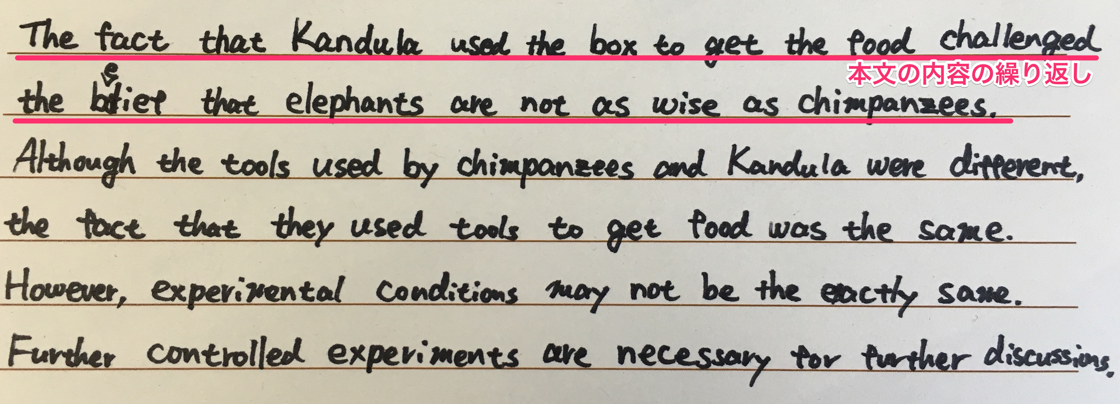 "繰り返し" になっていることが気になります。一文目を直訳してみると「Kandula が箱を使って食べ物を獲ったという事実は、象がチンパンジーほど賢くないという考えに異議を唱えた」となりますが、ここに書かれていることは本文中二段落目一文目に書かれている内容と同じであり、新情報は何も含まれていません。言ってしまえば、このセンテンスは本文で書かれていることの "繰り返し" であり、本文から導かれる結論ではありません。