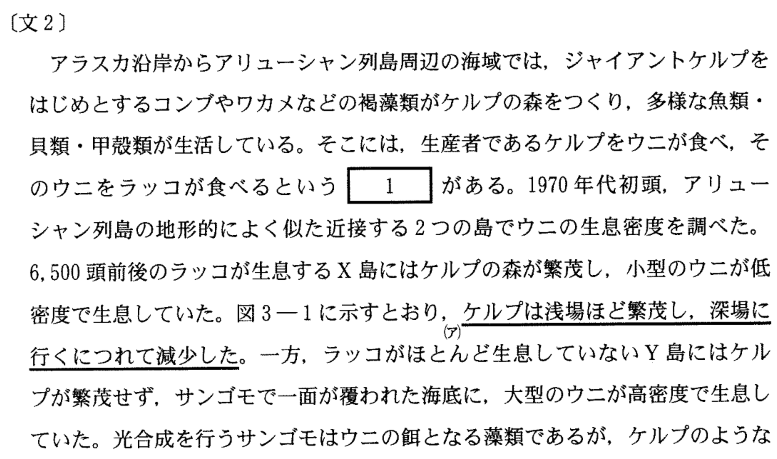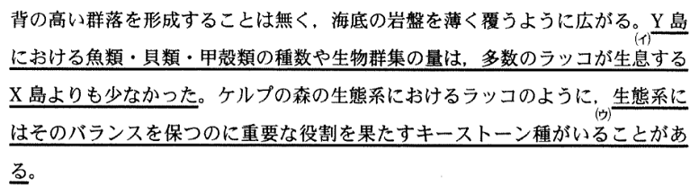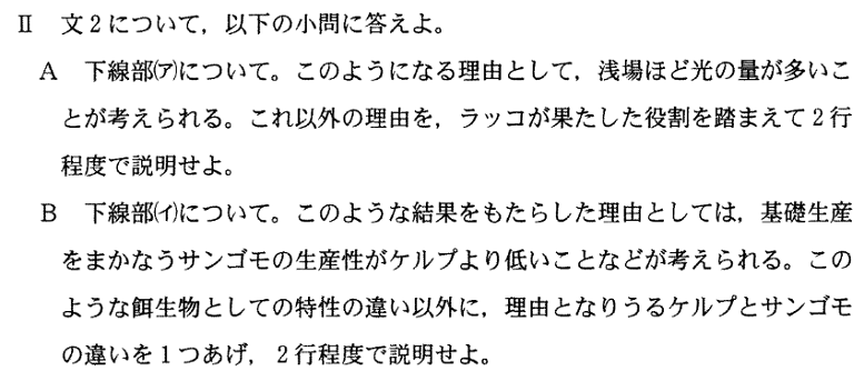 Y島での生物群集の量がX島より少ない理由を説明する問題です。Y島はX島と比べて、「ラッコがほとんどいない、ケルプが繁茂していない、サンゴモが多い、ウニが高密度に生息している」という違いがあることが書かれています。続けて、サンゴモがケルプと比べて、「背の高い群落を形成することはない」という違いがあることも書かれています。