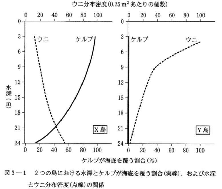 ここから、「深場ではラッコがウニを捕食できず、ウニによる食害でケルプが少ないが、浅場ではラッコがウニを捕食するため、ケルプが食害を受けにくくなっている」と考えられますね。