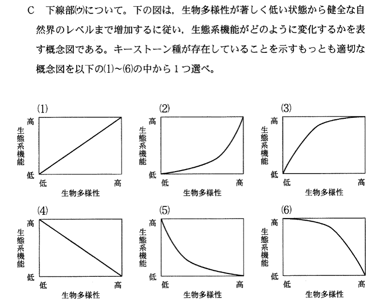 キーストーン種が存在する場合の、生物多様性と生態系機能の関係を答える問題です。今回の記事では示していませんが、文1で「生物多様性が高くなるほど生態系機能は高くなる」という記述があります。従って、(1)~(3)に解答は絞られます。ではその中のどれが正解か?