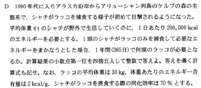 シャチが一年に必要なエネルギーは200000×365kcal、ラッコを一頭捕食して得られるエネルギーは30×1000×2×0.7kcalなので、シャチ一頭が一年に必要なラッコの頭数は、200000×365 / 30×1000×2×0.7=1738頭です。