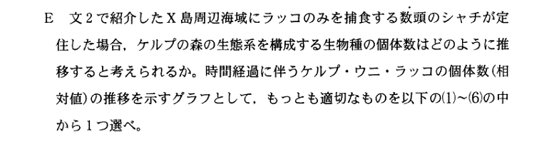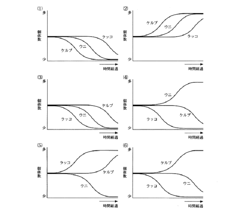 このように考えれば、ラッコが減少→ウニが増加→ケルプが減少、という風に個体数が変化していくことがわかります。これを反映しているグラフは、(4)のみですね。