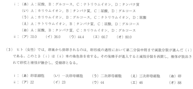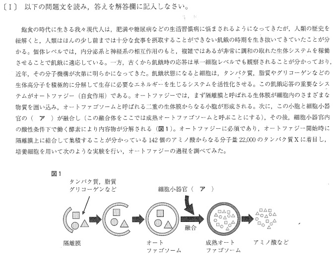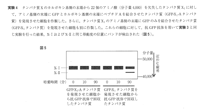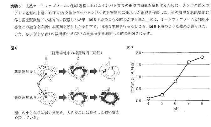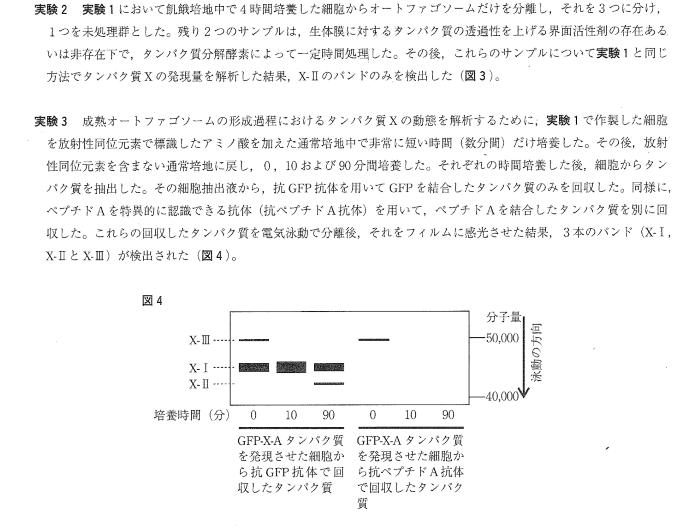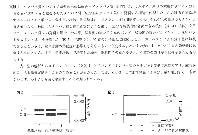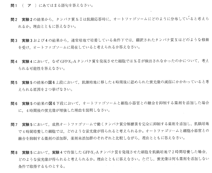 記述式の大問は全て実験考察問題です。あるひとつのテーマに対して複数の実験を行い、その実験結果からわかることを考察する、というスタイルです。これは東大生物にも共通する特徴です。難易度は標準~やや難、といったところです。東大生物の対策としてはかなりの良材と言えるでしょう。