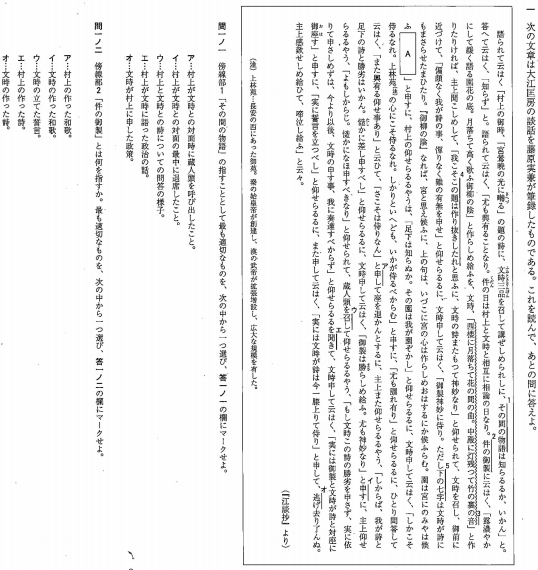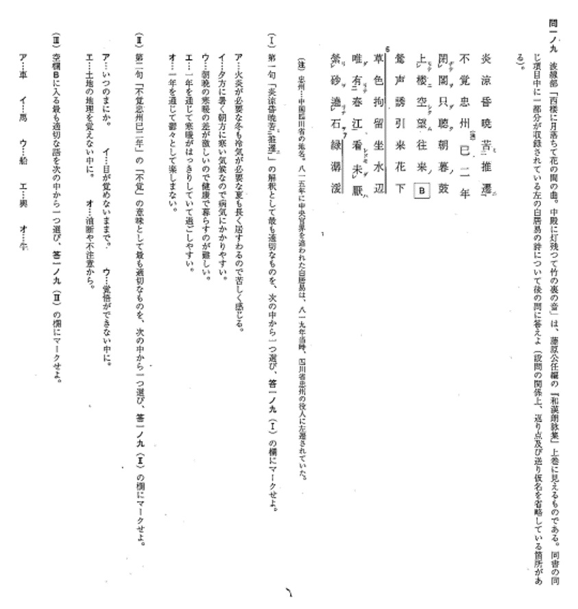 試験時間は90分で、東大同様古文・漢文・評論文が出題されます。2015年までは、古文・漢文がサンプル画像のような形で強引に同じ大問にまとめられ、総大問数は3題となっていたのですが、2016年にはそれが分割され4題となりました。よって、処理量はそれまでとあまり変化なく、適切な分量と言えるでしょう。ちなみに、漢文は漢詩の出題が多いです。