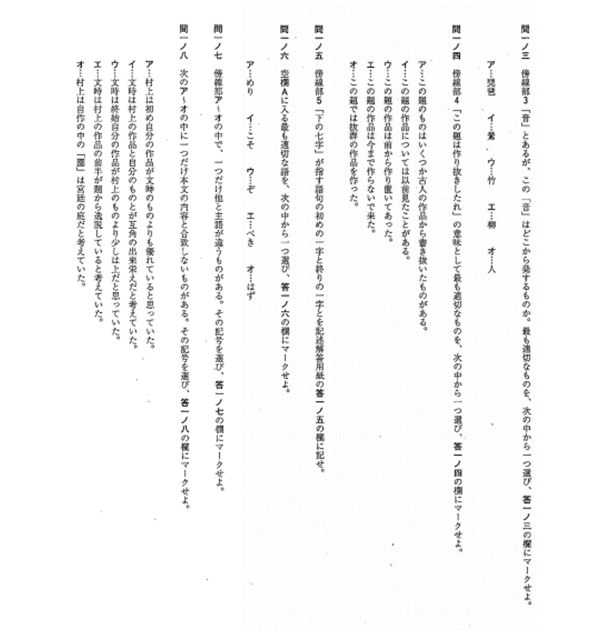 解答形式は基本的にマークシート方式ですが、一部、漢字の書き取りや該当箇所の抜き出し、知識事項等、答えを自分で記述させる設問もあります。中でも特筆すべきは例年最後の設問となっている、評論文の記述問題。本文終盤に引かれた傍線に関して、本文全体の主旨を踏まえた上で100~130字で説明させる(字数・細かい指示は年度による)というもので、ほぼ東大の第1問(五)そのものです。かなり東大を意識しているのかと思いきや、今年は字数が120~180字となり、若干東大から離れてしまいました。その真意は…?