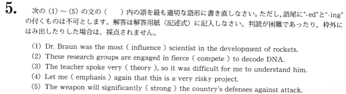 その後ろには大問3に会話文、大問4に文法・語彙問題、大問5に派生語記述、大問6に和訳に合わせた単語の記述が続きます。全ての問題に共通することは、とびぬけて難しい知識は必要ないが、市販の単語帳や参考書に書かれている知識は隅々まで暗記していなければならない、ということです。