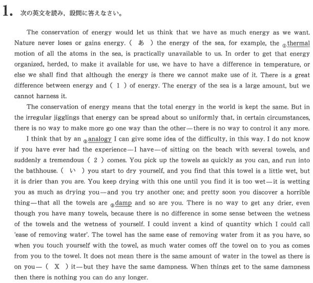 大問1,2は600~700語程度の長文読解です。語彙は少し難しめですが、文は短めで要旨も明快であるため、それほど読みにくいという印象は受けません。東大はもちろん、後述する早稲田理工の長文よりも解きやすいでしょう。