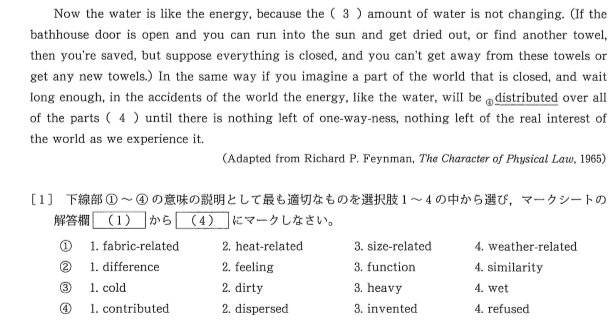 大問1は1000語オーバーの本格的な長文問題です。厄介なことに主に科学に関する専門用語が多く出てくるため、それらの意味を推測しながら読み進める必要があります。加えて、内容一致問題の選択肢が文全体の内容を含んでおり、どこにどのような内容が記述されていたかを瞬時に思い出す力が必要です。