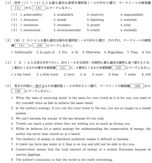 大問2は難易度の高い並び替え、大問3は適誤挿入と段落整序問題です。段落整序問題は東大の大問2(b)とかなり近い形式であるため、いい練習となるでしょう。段落整序問題は他の大学では出題例が少ないので早稲田理工の受験予定がない人もこの問題だけは2(b)対策として解いてみてはいかがでしょうか。