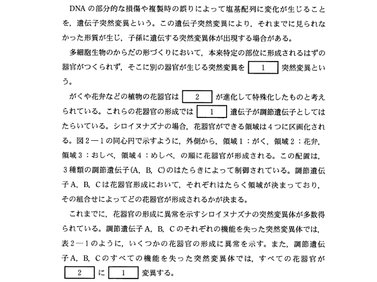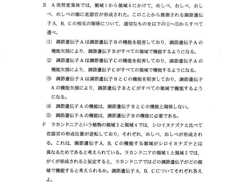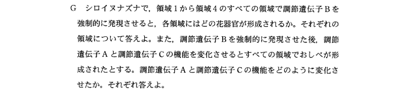 現課程を学習しているみなさんなら、花器官の形成における遺伝子の働き方を説明したABCモデルはご存知だと思いますが、実はABCモデルは旧課程では教科書に載っていませんでした。今回扱う問題は旧課程の時期のものですので、東大生物においては「知らないものが出てきたときにいかにそれを速く理解し、対処できるか」という力が試されているといえるかもしれません。