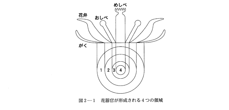 シロイヌナズナですべての領域で遺伝子Bが発現すると、領域1と2では遺伝子AとBの機能により花弁が形成され、領域3と4では遺伝子BとCの機能によりおしべが形成されます。