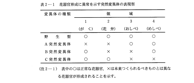 まずは表2-1を見てみましょう。A突然変異体では領域1および2に異常が見られるようです。同様にB突然変異体では領域2と3に、C突然変異体では領域3と4にそれぞれ異常が見られます。