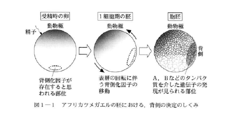 まさしくこれが答えで、灰色三日月環を含む部分が均等に両割球に配分されるかされないかの違い、ということになります。