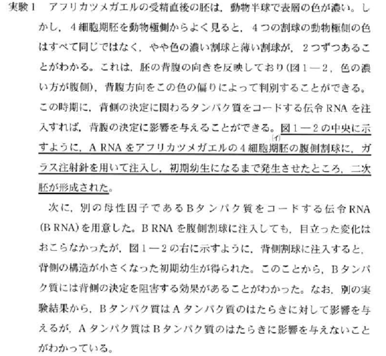 ちなみに、(2)~(6)はなにが違うのかを検討します。(2)は(1)の反対の結果を示しているものなので当然間違いです。(3)と(4)は、Aタンパク質やBタンパク質が頭部肥大胚の形成に関わっているなどという内容は今回の問題文には全く出てきていないため、間違いです。(5)と(6)は、今回はA RNAとB RNAの混合液を腹側に注入しているため、背側構造の大きさには影響しないので間違いです。(背側構造が小さくなるのは、B RNAが胚の背側割球に注入された場合です。腹側割球に注入された場合は、目立った変化が起こらないと問題文に書いてあります。引っかからないようにしましょう!)
