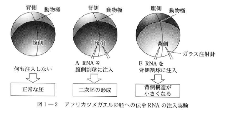 この実験を詳しく解釈していきましょう。まず、「A RNAを注入する」と、注入された箇所でRNAからタンパク質が翻訳されるはずですから、「A RNAを注入する」=「Aタンパク質を注入する」と考えることができます。また、二次胚とは、本来の胚とは別にできる構造体のことを指します。つまり、本来の胚である一次胚から別の体が生えているような状態になるわけですね。A RNAは将来腹側になる箇所に注入されました。すると、その箇所に二次胚ができたということは、「腹側になるはずだったのに、A RNAを注入されたことによって背側になってしまった」ということになります。