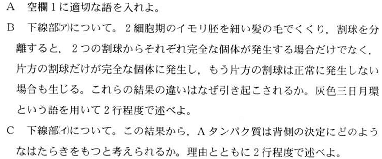 B 灰色三日月環が第一卵割で両割球に分配されれば分離後正常に発生するが、分配されない割球ができるとその割球は正常に発生しないから。(63字)