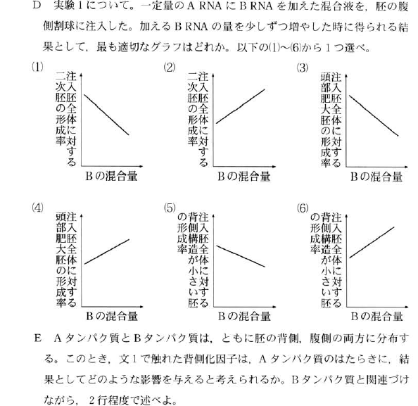 Cで検討したとおり、Aタンパク質は背側構造の形成を促進する働きがあります。つまり、二次胚を形成する働きを持ちます。また、Bたんぱく質については、「背側の決定を阻害する効果がある」とあります。つまり、二次胚の形成を阻害する、と考えられます。