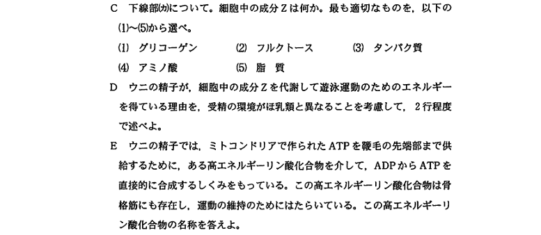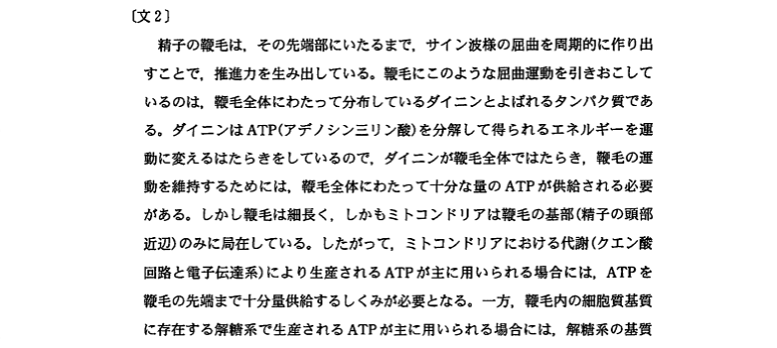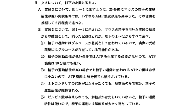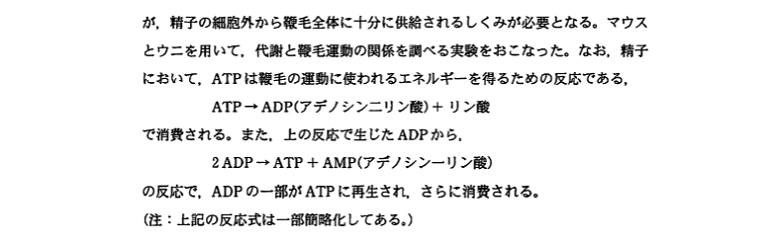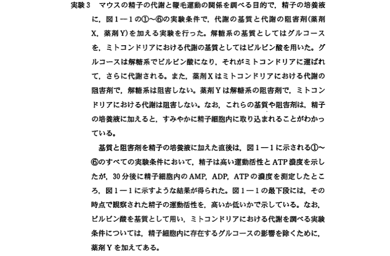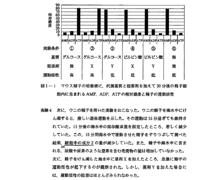 問題文に書かれていることと実験結果の両方を考慮に入れて考えることの必要性を感じてもらえたのではないでしょうか。哺乳類とウニの精子が、それぞれどのようにして運動に必要なATPを得ているのか、なんて知識は、受験生の誰も知らないですよね