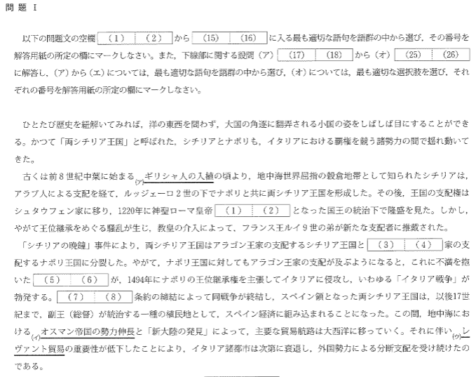 60分大問5題。例年大問Ⅰ~Ⅳがマーク形式、大問Ⅴが200文字〜250文字の中論述1題となっています。論述を除くほとんどが、正誤問題です。また、中論述は東大の第1問と第2問をミックスさせた形式といったところ。キーワードが与えられ、その使い方が難解である点は第1問と、字数や知識レベル、出題範囲(時代・地域)の限定度合いは第2問と酷似しています。