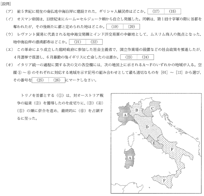 全てマーク形式のため判断の難しいところではありますが、分量としては東大よりもやや少ないと言えるでしょう。サンプル問題を見ていただくとわかるように、欲しい言葉を大量の用語群の中から選んで解答する形式のため、情報処理能力も必要とされています。地図問題も難解です。